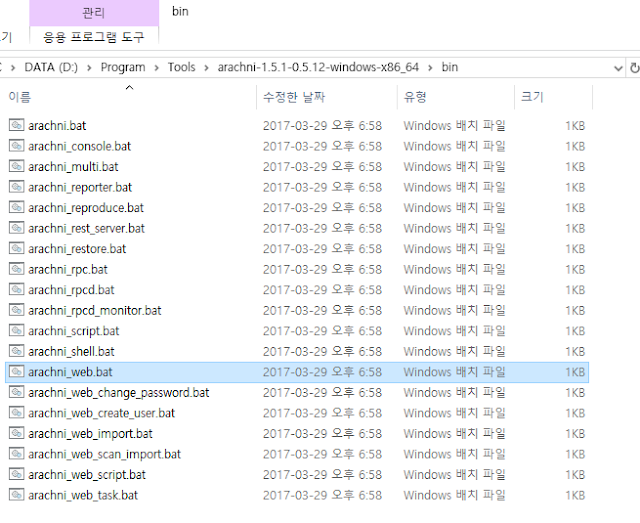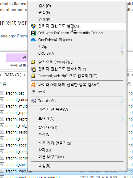 arachni_web.bat 파일을 마우스 오른쪽 클릭을 해서 관리자 권한으로 실행합니다.