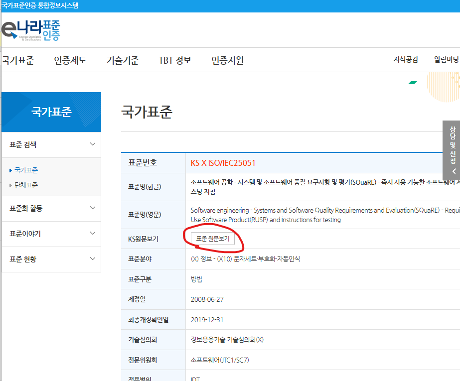 표준 원본보기 버튼을 누르면 표준을 볼 수 있습니다.
