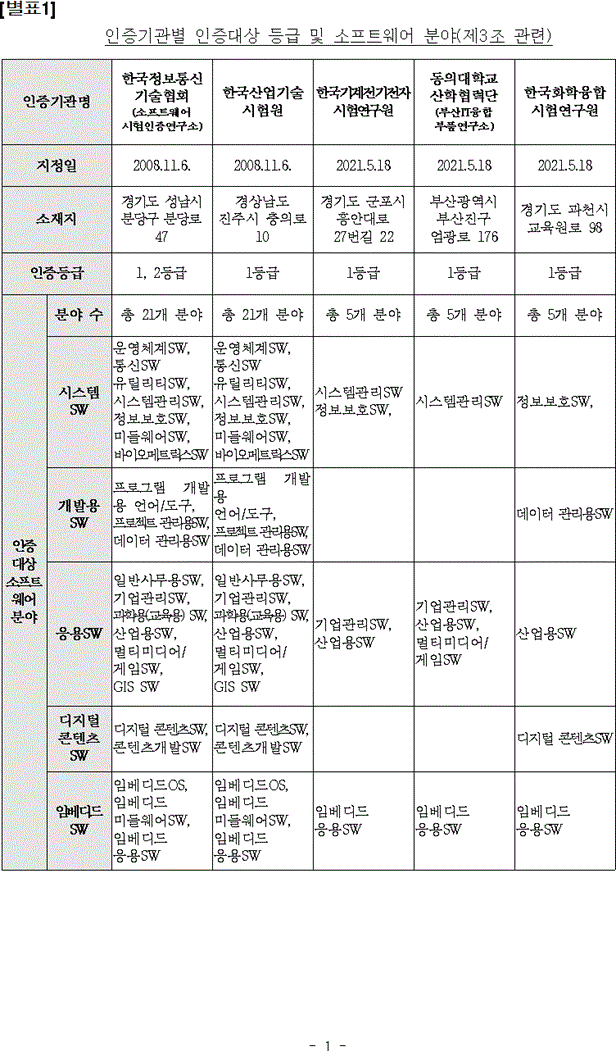 [별표 1] 인증기관별 인증대상 등급 및 소프트웨어 분야(제3조 관련)