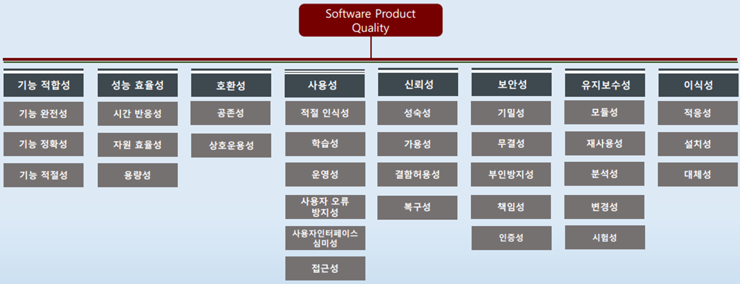 기능 적합성, 성능 효율성, 호환성, 사용성, 신뢰성, 보안성, 유지보수성, 이식성