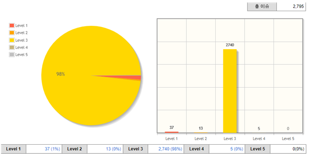 - Level 1에서 37개, Level 2에서 13개, Level 3에서 2,740개, 위험도가 낮은 수준인 Level 4에서 5개, Level 5에서 0개 이슈 검출
