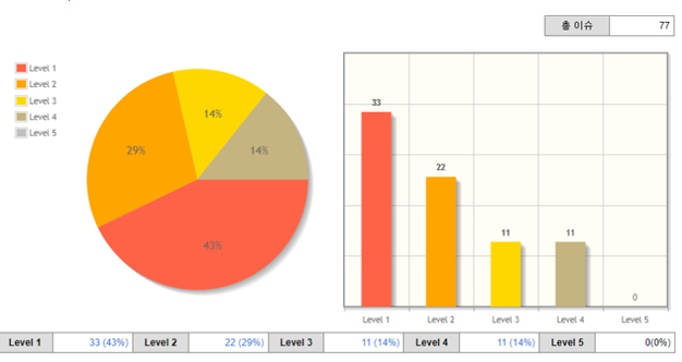 - Level 1에서 33, Level 2에서 22, Level 3에서 11, 위험도가 낮은 수준인 Level 4에서 11, Level 5에서 0개 이슈 검출