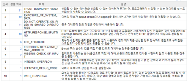 점검 항목은 분석하여 검출하는 기준으로서 품질 (‘Security’) 품질 특성 기반으로 195개 항목을 설정함