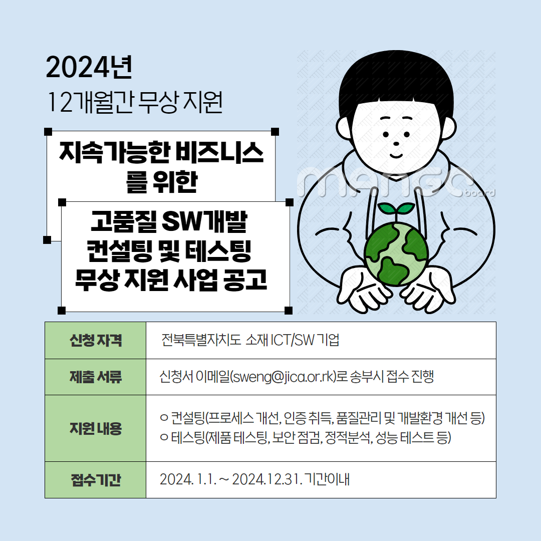 2024년 지속가능한 비즈니스를 위한 고품질 SW 개발 컨설팅 및 테스팅 무상 지원 사업 공고