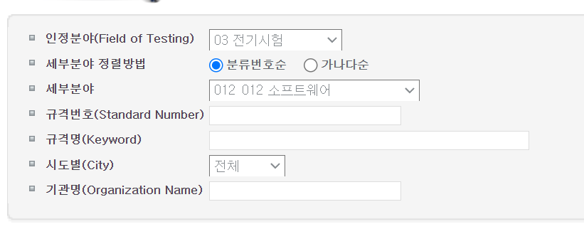 소프트웨어 분야(03.전기시험 - 012.소프트웨어) KOLAS 시험기관을 검색하면
